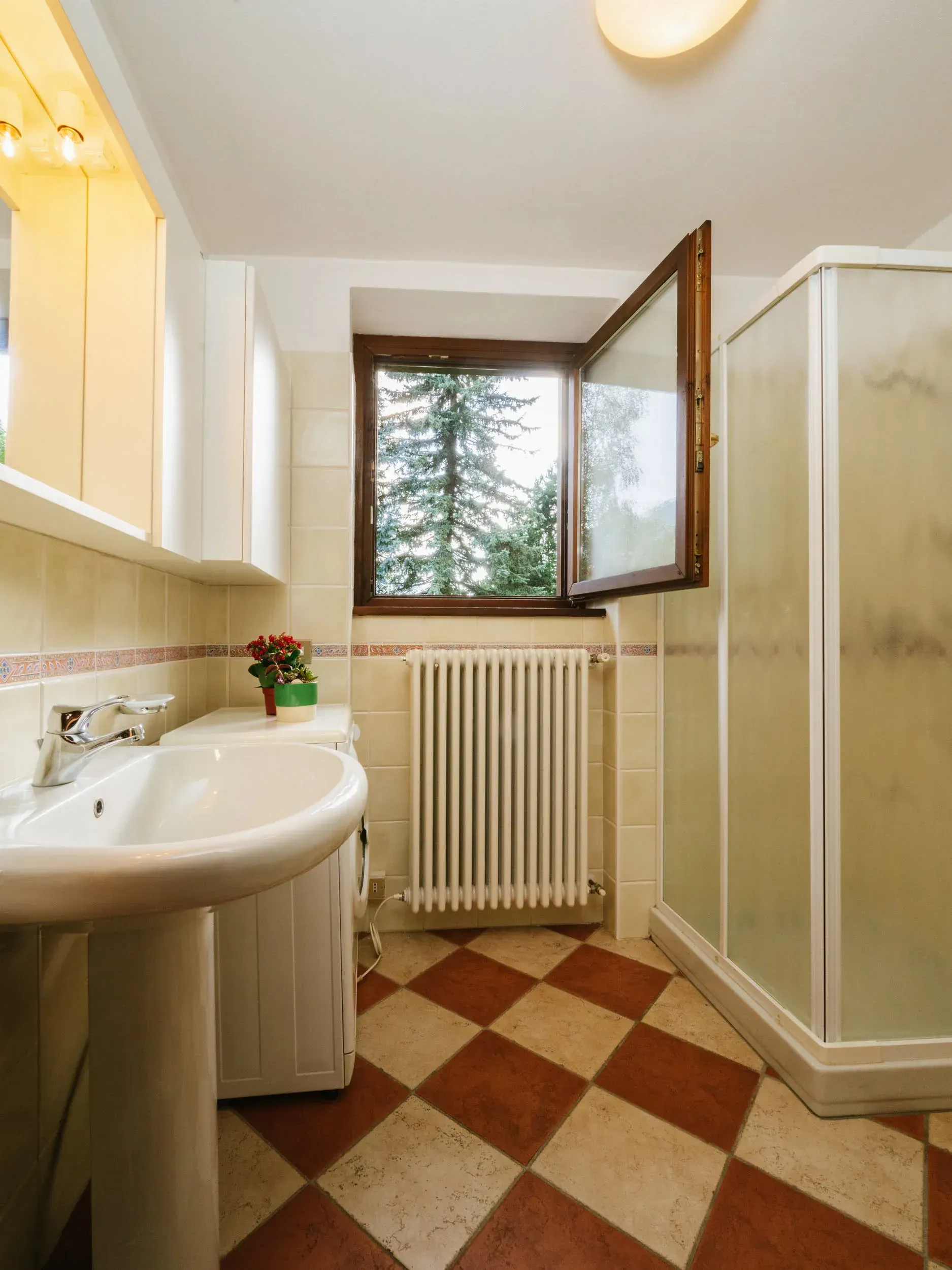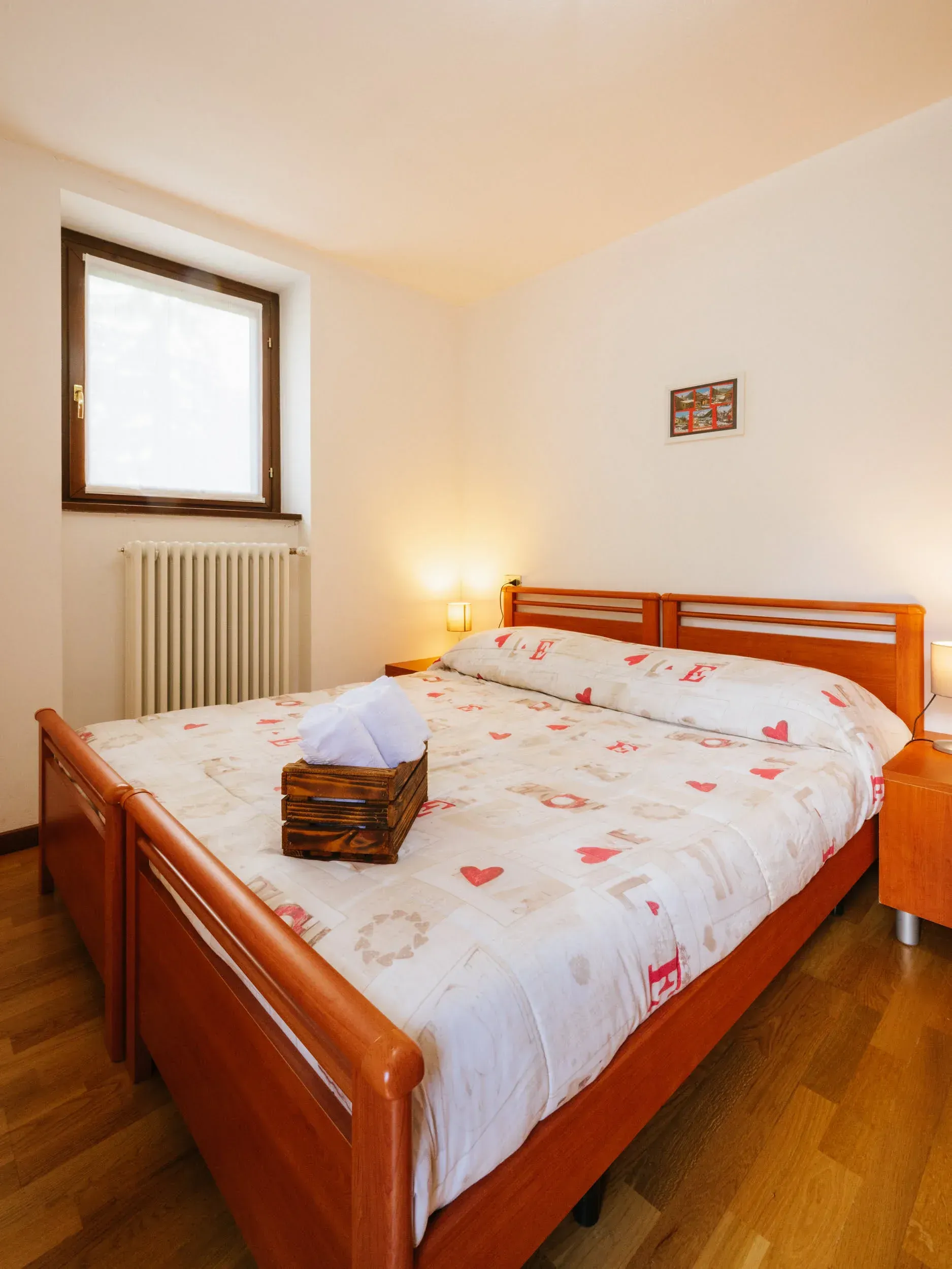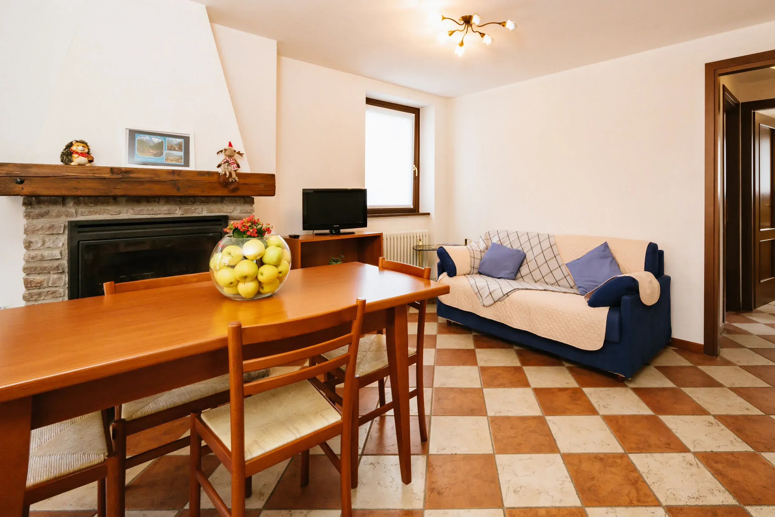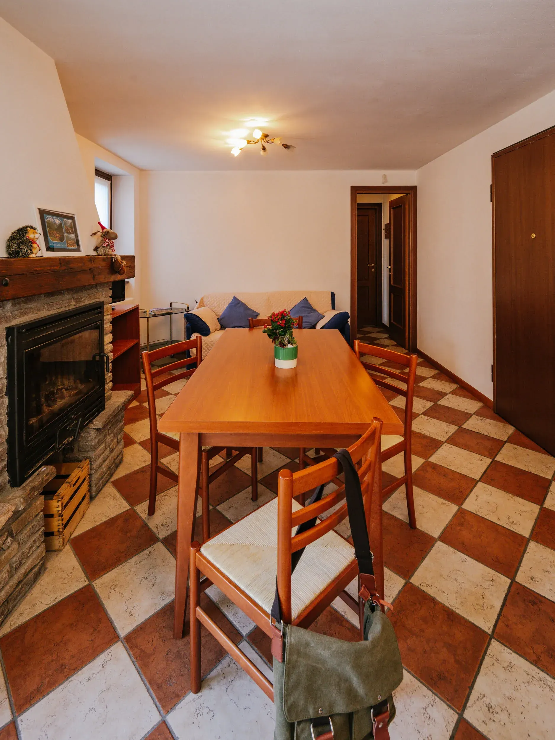 Un appartamento trilocale pensato per chi viaggia in famiglia e desidera libertà e comfort. Due camere, una matrimoniale e una con letto singolo, offrono lo spazio giusto, mentre il camino acceso riempie l'atmosfera di calore.